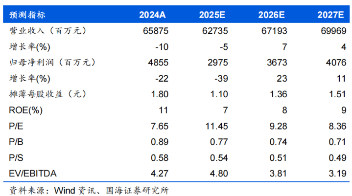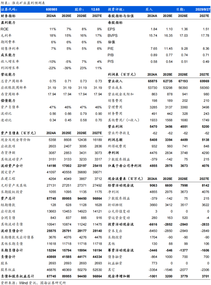 盈利预测与估值:我们预计公司2025-2027年实现营业收入分别为627/672/700亿元,同比-5%/+7%/+4%,归母净利润分别为30/37/41亿元,同比-39%/+23%/+11%;EPS分别为1.10/1.36/1.51元,对应当前股价PE为11/9/8倍。考虑到公司长协定价为主,煤炭业务经营有望稳健向好,未来煤炭(陶忽图煤矿预计2026H1建成投产、信湖煤矿2024年底已进行系统性恢复工作)、煤化工、火电(安徽省“十四五”重要支撑性电源2×660MW超超临界燃煤发电机组项目,力争年底前实现“双机双投”)板块仍有产能增量,公司未来成长空间可期,维持“买入”评级。